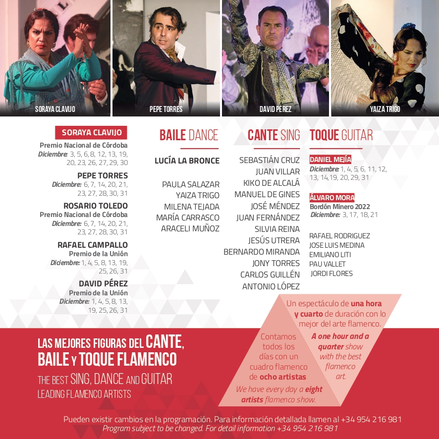 Merche Esmeralda, María Jimenez, Don Antonio Mairena, La Paquera de Jerez, Manolo Marín, Gabriela Ortega, Los Farruco, Matilde Coral, Enrique El Cojo, Trini España, Paco Taranto, Chocolate, Ana Mari Bueno, Manuela Carrasco, Naranjito de Triana, Los del Rio, Los Romeros de La Puebla, Isabel Romero y tantos otros…